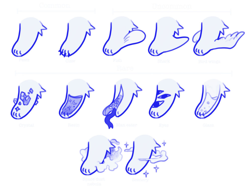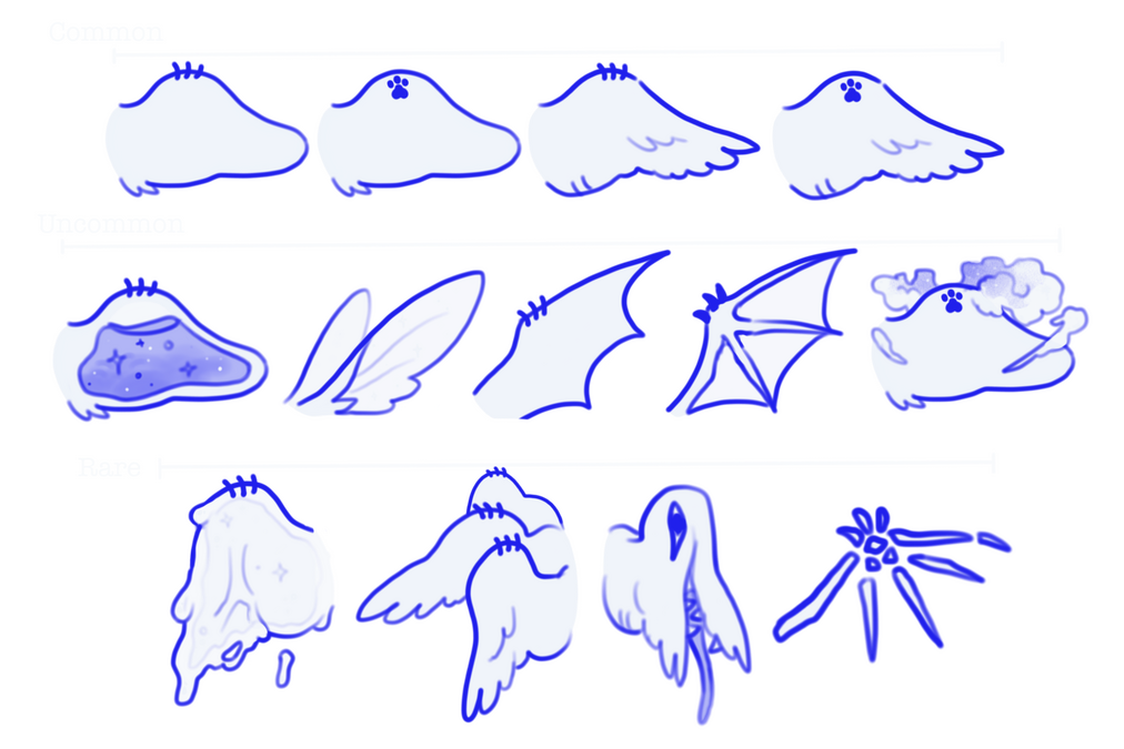 Common: have only 1 gem and 1 colorUncommon: have 2-3 gems on their body random colorRare: multiple gems and random color